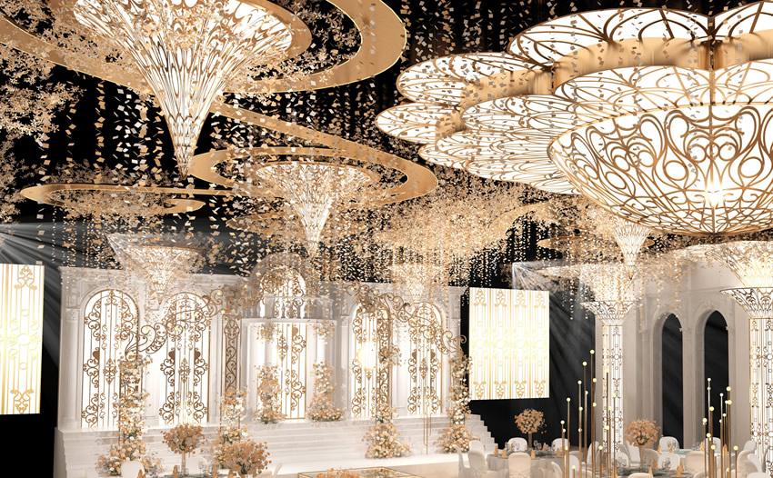 酒店婚礼堂的设计需要考虑多个方面,包括但不限于场地布置、仪式流程、餐饮服务、娱乐活动以及婚房的准备等。以下是一些关于酒店婚礼堂设计的建议: